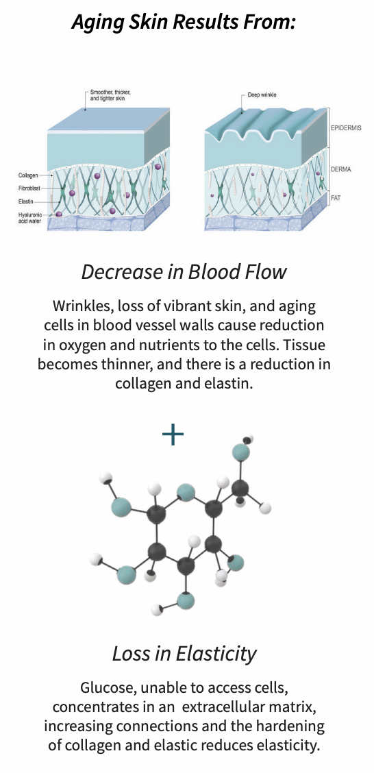 Blood flow decreases, glucose becomes less effective, collagen and elastin weaken — and the skin loses its tone and ability to repair.